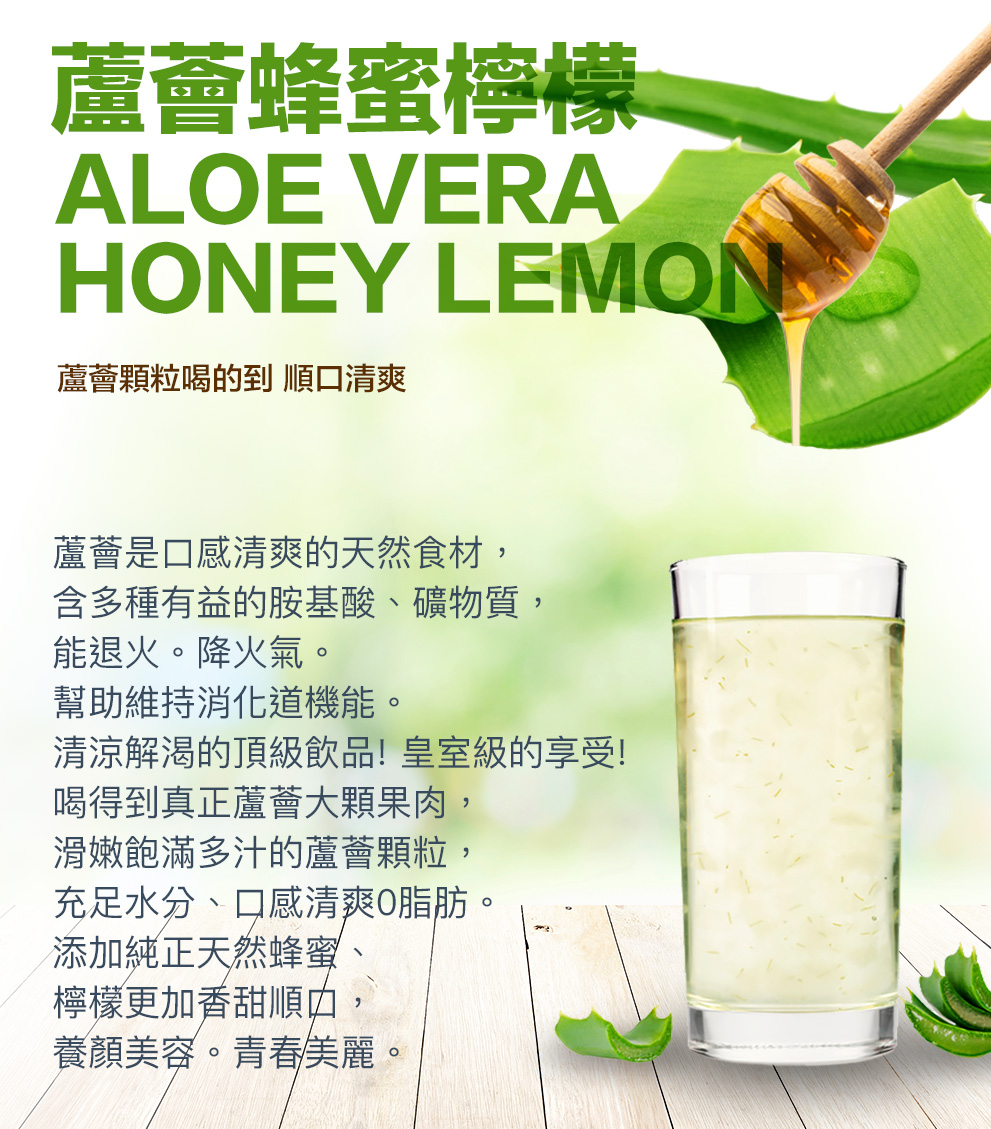 蘆薈是口感清爽的天然食材,含多種有益的胺基酸、礦物質,能退火。降火氣。幫助維持消化道機能。清涼解渴的頂級飲品! 皇室級的享受!喝得到真正蘆薈大顆果肉,滑嫩飽滿多汁的蘆薈顆粒,充足水分、口感清爽0脂肪。添加純正天然蜂蜜、檸檬更加香甜順口,養顏美容。青春美麗。
